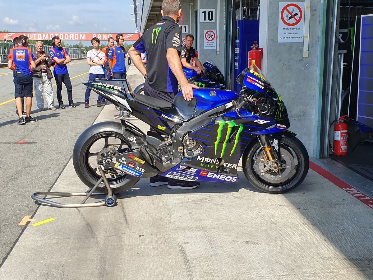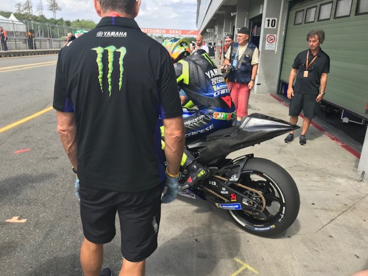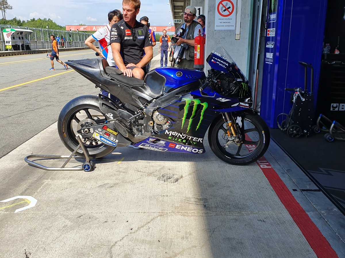 La nuova M1 che abbiamo visto a Brno stamattina.Secondo quanto dicono in Yamaha, la moto ha un motore dotato di un set-up evoluto; si può notare, però, che è stato montato un reggisella diverso. Questo porta a pensare che l'ingombro del motore nella zona del cambio sia diverso e quindi ci sia stato bisogno di ridisegnare la parte centrale della moto. In effetti, confrontando bene le foto, si notano delle differenze in tanti piccoli dettagli.