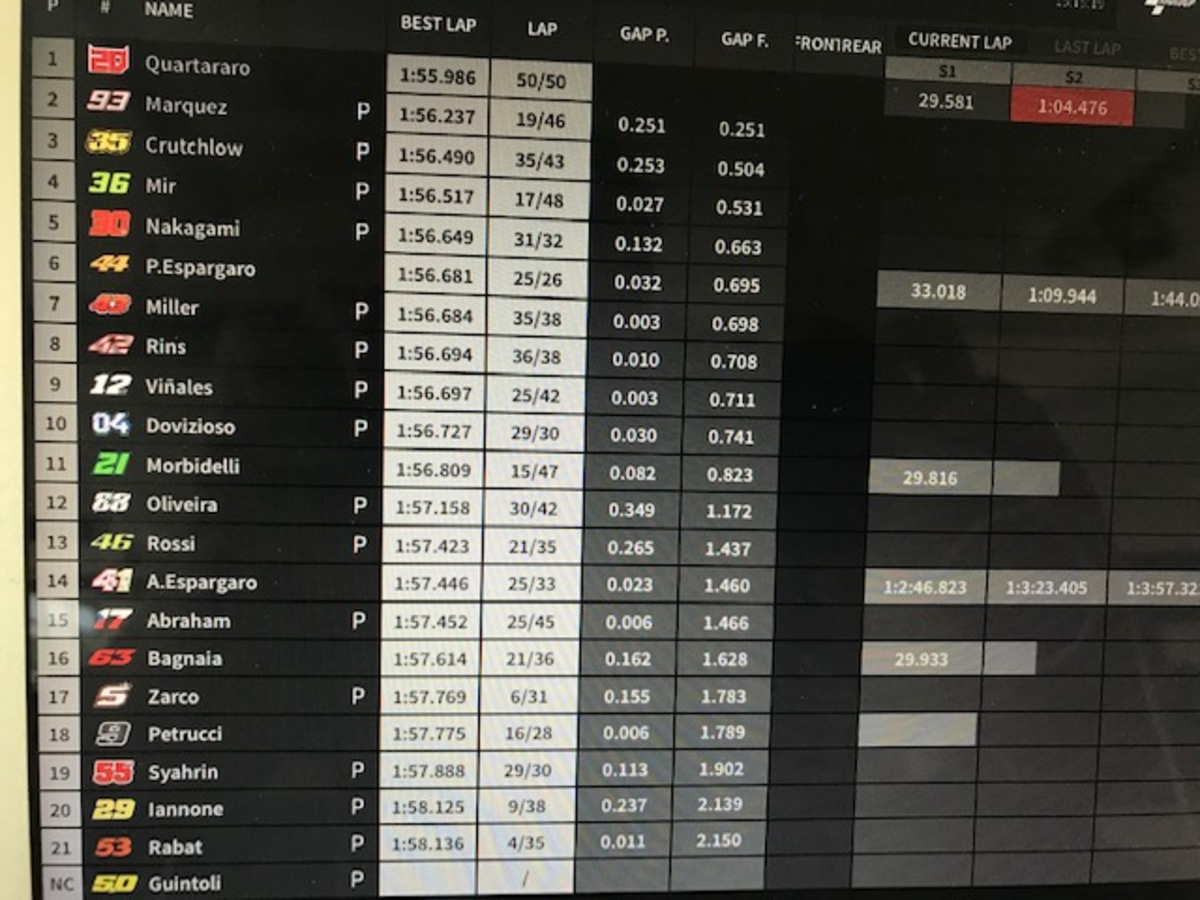 Marc Marquez: “Ho fatto 70 giri, più di quanto avessimo programmato. Abbiamo lavorato sia per il 2019 sia per il 2020: per quest’anno, abbiamo utilizzato la carenatura evoluzione, che ha dato esiti positivi. Adesso studiamo bene i dati, ma potremmo già omologarla per l’Austria: dobbiamo essere sicuri, perché si può fare una sola evoluzione durante la stagione, ma i riscontri sembrano positivo. Per il 2020 abbiamo provato un nuovo telaio, che non è quello con i rinforzi in carbonio, ma uno inedito, diciamo una via di mezzo tra quello tradizionale e quello con i rinforzi: è emerso qualcosa di positivo, ma è solo il primo prototipo”.