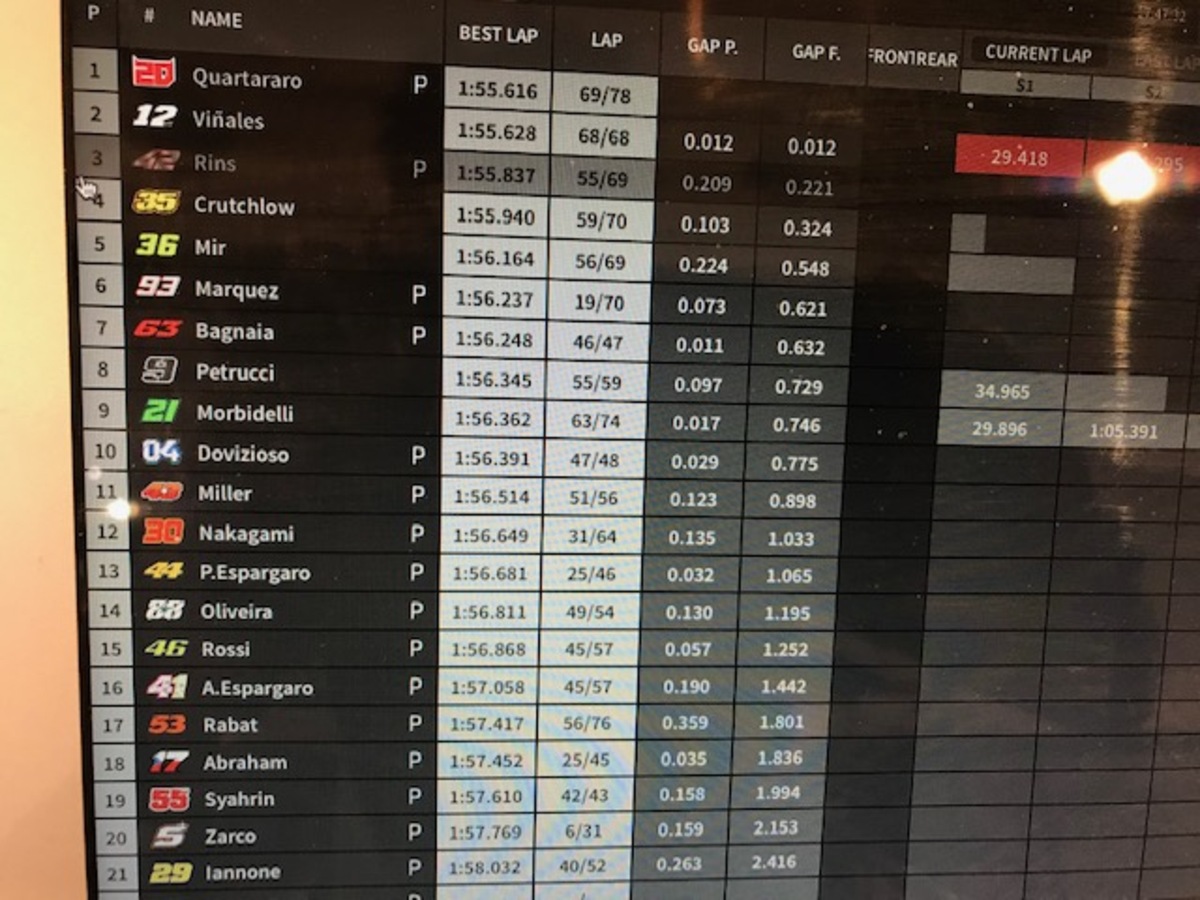 In questo momento dovizioso è in pista dietro a Rossi. Ecco il commento di Bernardelle a bordo pista alla curva 1:”Rossi può aprire un pochino prima il gas: sotto questo aspetto la Yamaha conserva un piccolo vantaggio, chiude meglio la curva”