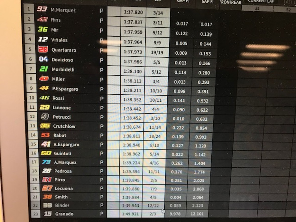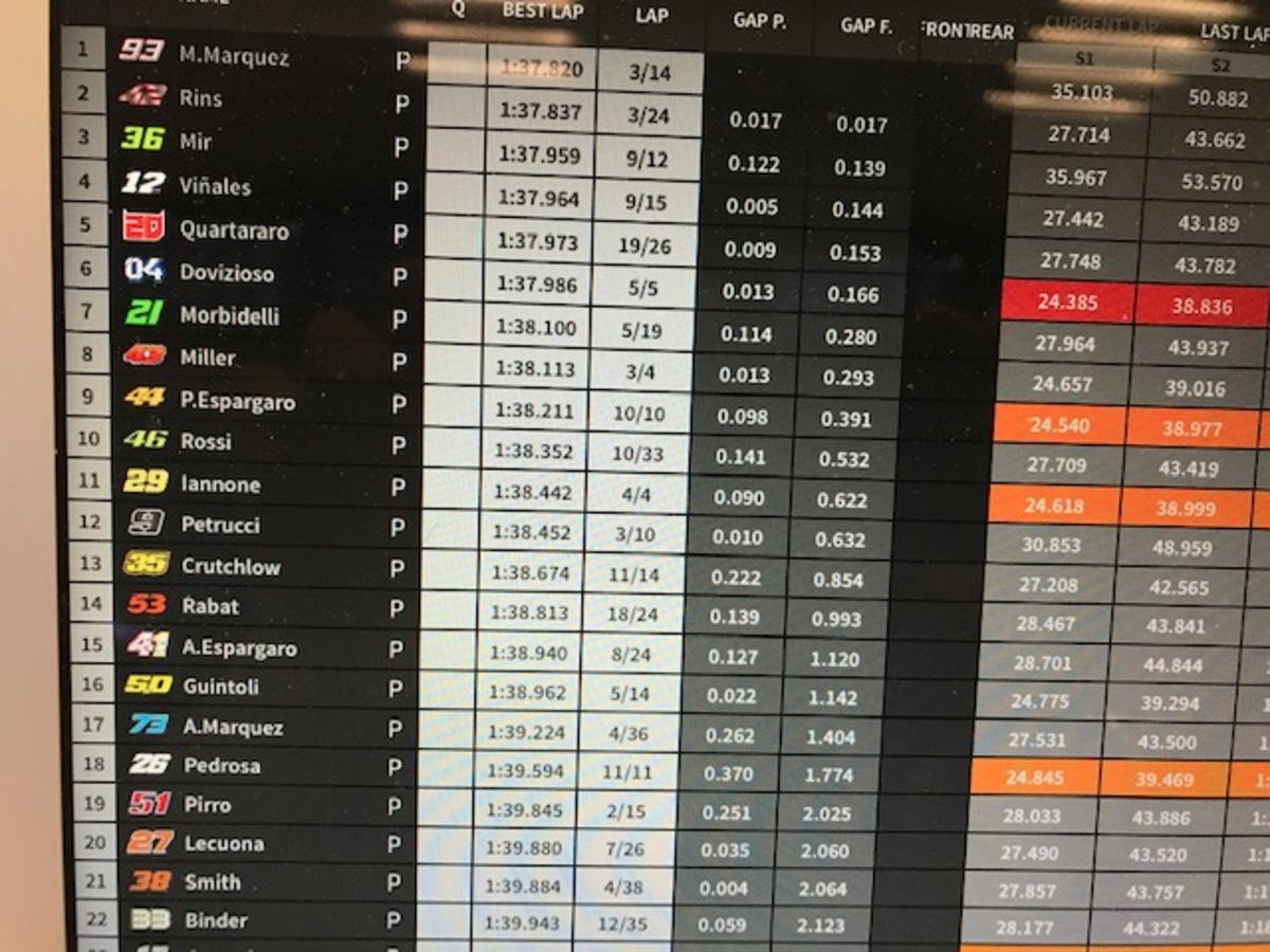 Al momento, 1 marquez in 1’37820, poi Rins mir e Vinales. 6 dovizioso a 0”166, 7 Morbidelli , 10 Rossi a 0”532, 11 Iannone , 12 Petrucci