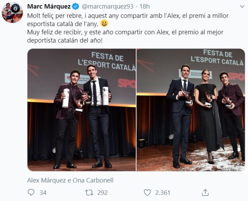 I fratelli Alex e Marc Márquez sono stati premiati ieri sera Barcellona come “migliori atleti catalani dell’anno” durante la Festa dello Sport Catalano. I due nuovi compagni di squadra nel team Honda MotoGP sono anche i campioni in carica MotoGP e Moto2.