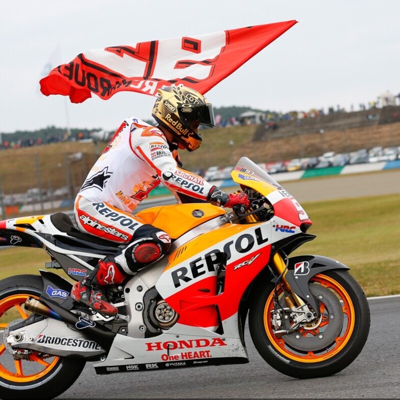 A Motegi la pressione è alta: Honda vuole la vittoria sulla pista di casa, ma la RCV non sembra particolarmente a suo agio sul tracciato giapponese. Al contrario, Ducati e Yamaha in prova sembrano volare e Marquez si perde un po' in qualifica, mostrando un po' le stesse difficoltà viste a Misano. Stavolta però tutto va come deve andare nei piani del team HRC, e Marquez controllando Rossi e Pedrosa agguanta un secondo posto dietro a Lorenzo e si laurea per la seconda volta Campione del Mondo della MotoGP. Batte così il record della doppia vittoria consecutiva nella massima serie, come pilota più giovane, che era di Mike Hailwood