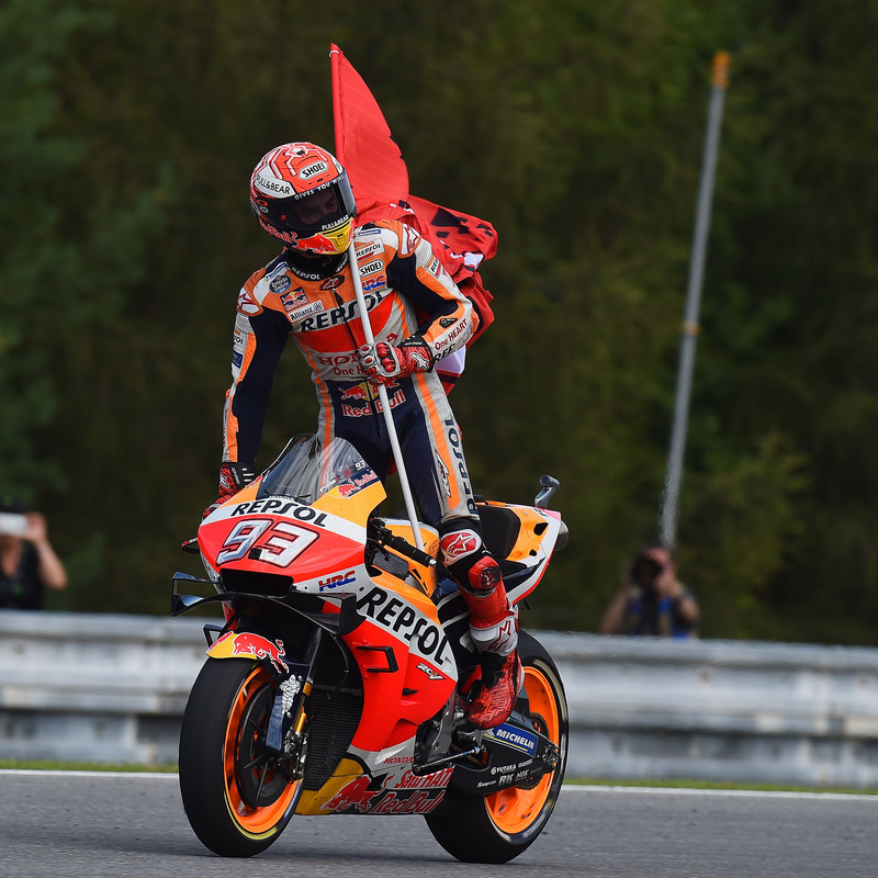 Lui che guasta, che provoca, che asfalta, che devasta. La parola giusta è una e una sola: umilia. Se guardi la tecnica resti stupefatto: come può fare quello che fa? Non cade, eppure rischia la qualsiasi; se cade, si rialza. Va sul bagnato con le slick e bastona chiunque, si prende pure il gusto di mancare di rispetto a Rins e poi davanti ai microfoni irride la scelta gomme del suo avversario principale, Dovizioso, che a questo punto del campionato definirlo principale è un di cui, visti i circa 60 punti di differenza.