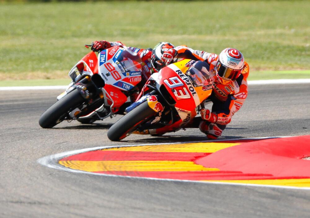 Successo di forza di Marc Márquez, davanti a Dani Pedrosa e Jorge Lorenzo. Gara decisiva per il mondiale? Molto probabile. Era chiaro, alla vigilia, che Márquez poteva vincere, mentre Dovizioso avrebbe dovuto limitare i danni. Purtroppo Andrea non ci è riuscito, chiudendo solo settimo: era arrivato qui appaiato a Márquez, lascia Aragón con un distacco di 16 punti. Non tantissimi, per la verità, ma vista la superiorità attuale del campione... Partito prudente con la gomma dura anteriore (unico assieme a Crutchlow), Márquez ha sinceramente fatto quello che ha voluto, andando in testa al 16esimo giro e vincendo perentoriamente.