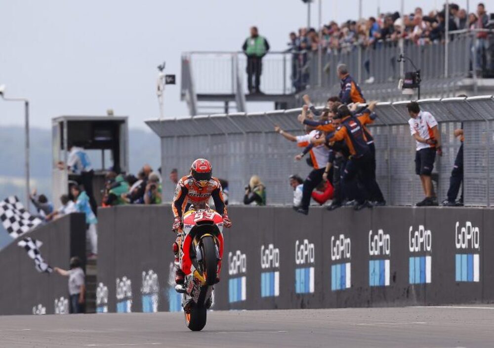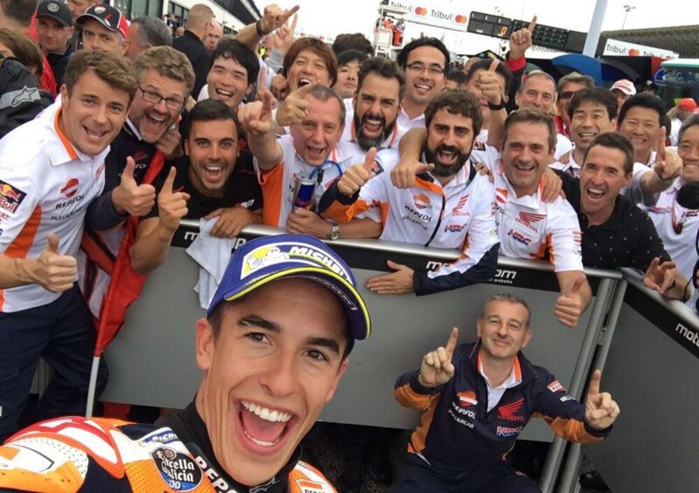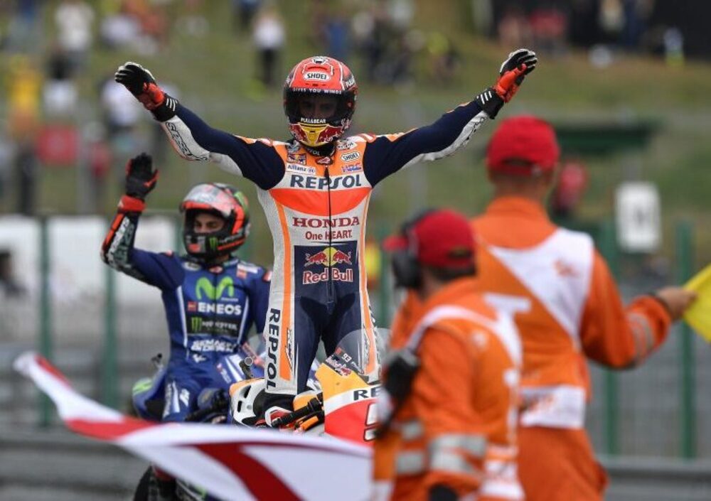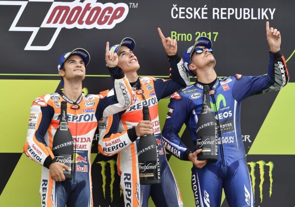 E’ il meteo il vero avversario dei piloti nel GP della Rep. Ceca che vede Marc Marquez vincere in solitario, davanti a Dani Pedrosa e Maverick Viñales. E’ stato un GP imprevedibile, “rovinato” dal meteo: si è partiti con le gomme da bagnato, ma già al secondo giro Marc Marquez, partito con la morbida posteriore, unico tra tutti i protagonisti, è rientrato ai box per cambiare la moto e le gomme. All’inizio quella di Marc sembrava una mossa sbagliata, quella della gomma morbida, invece si è rivelata azzeccata perché ha quasi obbligato Marquez ad anticipare il rientro. Al terzo giro Marquez era 19esimo a 22”138m, al quarto era già 12esimo a 11”975 mentre gli altri cominciavano a rientrare ai box. Purtroppo, lo hanno fatto con un giro di ritardo Rossi e Dovizioso, rientrati insieme al quinto giro: uno sbaglio, purtroppo determinante, se non per la vittoria – Marquez non si batteva – quanto meno per il podio. Entrambi poi velocissimi sull’asciutto, hanno rimontato rispettivamente fino alla quarta e alla sesta posizione, con Pedrosa ottimo secondo e Viñales terzo.