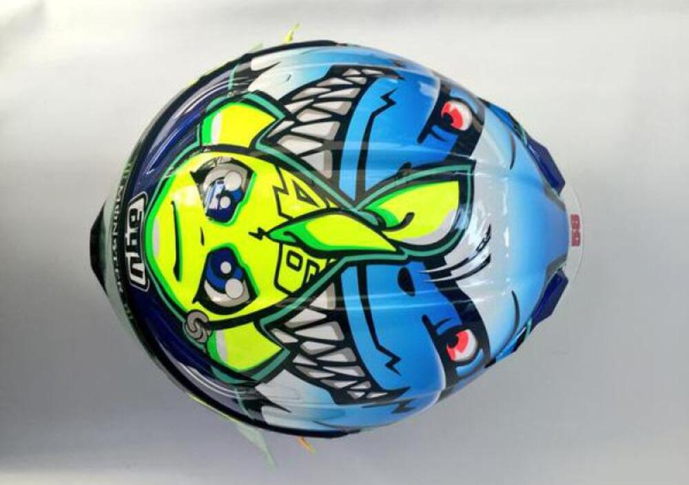 Non ha bisogno di spiegazioni il casco speciale che rossi ha sfoggiato per il GP di San Marino. Un pesciolino giallo inseguito da un grosso squalo e la scritta "via via via". Il richiamo alla classifica è evidente con Rossi davanti braccato da un Lorenzo in grandissima forma. Un particolare però richiede attenzione: gli occhi del pesciolino giallo. Nell'espressione del piccolo "Vale" non c'è paura o panico, ma solo determinazione e concentrazione.