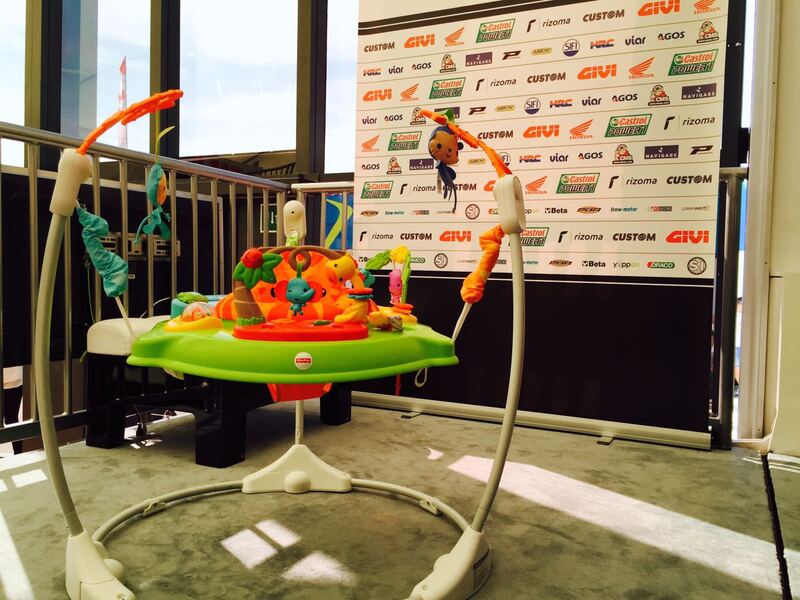 Quest’anno, la bella e dolce Lucy, compagna di Cal Crutchlow, viene spesso ai GP in Europa, assieme, naturalmente, alla bimba Willow, nata lo scorso agosto. Così, il team di Lucio Cecchinello, sempre molto attento a far stare al meglio possibile il proprio pilota (e non solo!) ha creato all’interno dell’hospitality uno spazio per la piccola Willow, con giochi, gonfiabili, palette e secchiello, e tutto quanto per farla felice. Bravi, come sempre.