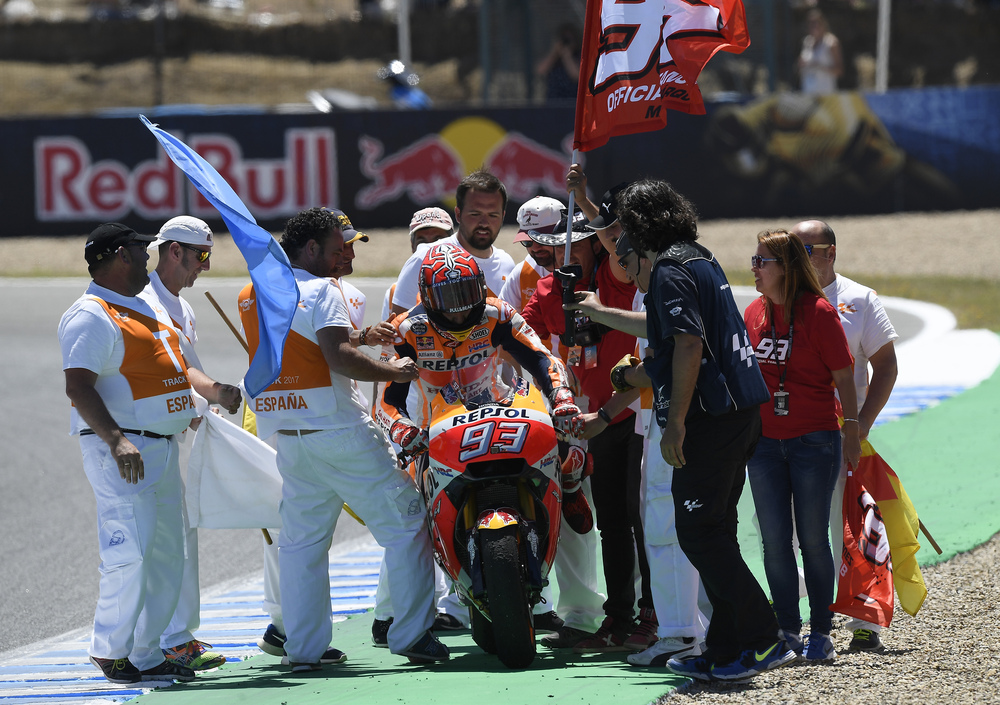 A proposito di “botti”, anche Marc Marquez ne ha fatto uno abbastanza clamoroso, non in moto, però: al termine del GP, dopo essersi fermato a salutare i tifosi, ha avuto un piccolo incidente saltando dalle barriera (sequenza fotografica di Milagro).