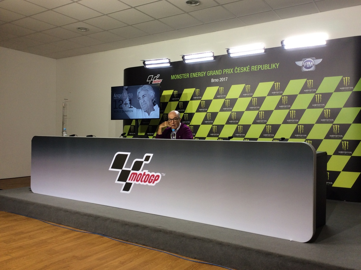 Un commosso Carmelo Ezpeleta ricorda l'amico Angel Nieto: "la famiglia ci ha chiesto di continuare il normale programma del gp. La famiglia ha anche deciso che i funerali si terranno a settembre, dopo il gp Gran Bretagna, per permettere a tutti i suoi amici della MotoGP di partecipare. Angel sarà sempre con noi"