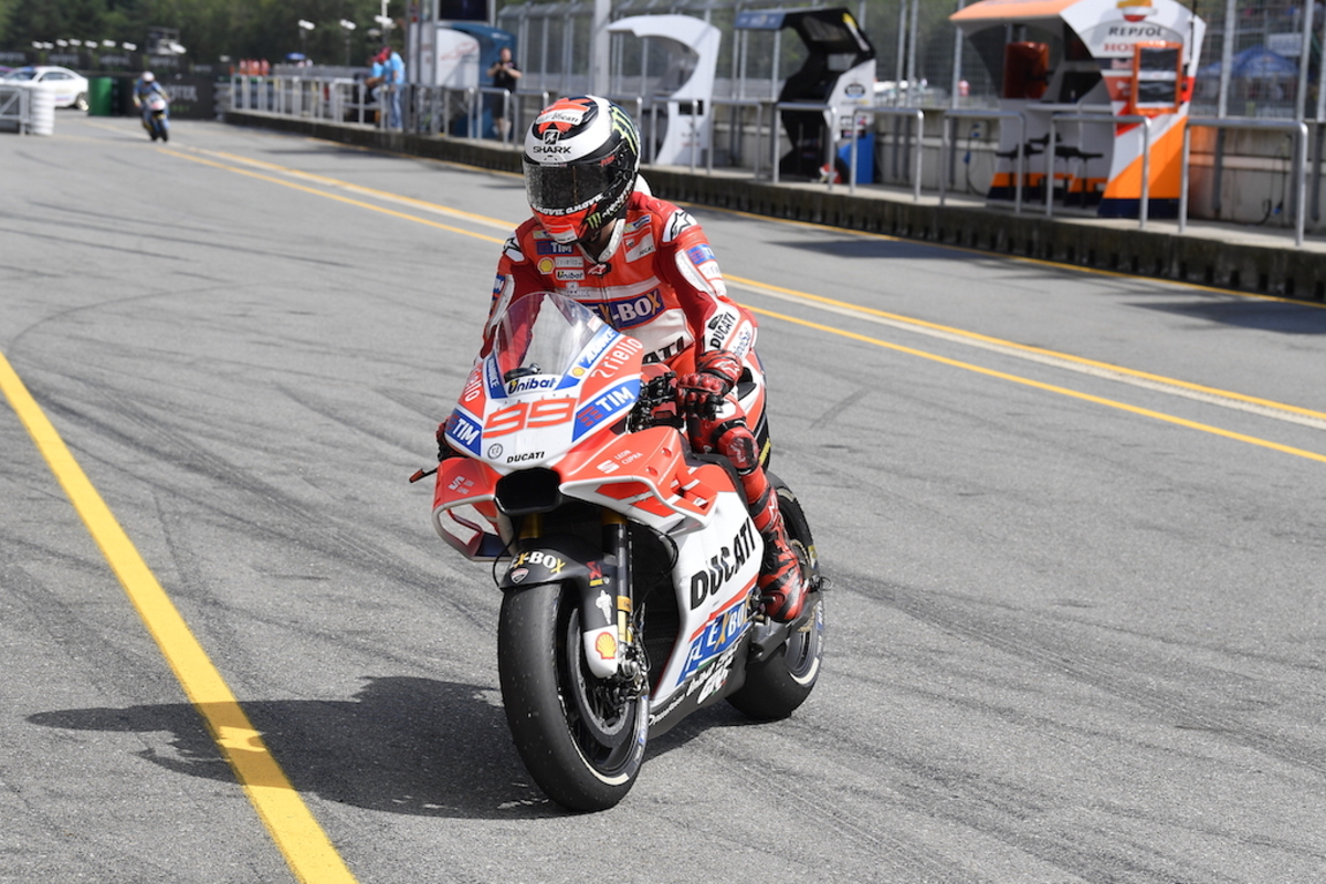 Lorenzo:" intanto devo fare i complimenti a ducati che continua a lavorare tantissimo per migliorare la moto e rendermi la vita un po' più facile. Il primo impatto con la nuova carenatura è stato positivo, anche se naturalmente bisogna lavorare ancora. Purtroppo abbiamo avuto poco tempo, ma questa soluzione mi sembra migliorativa. Nelle fp1, con l'acqua, mi sono trovato molto bene. Giochi di squadra? È presto, ma se ce ne fosse bisogno sono disposto ad aiutare Dovi"