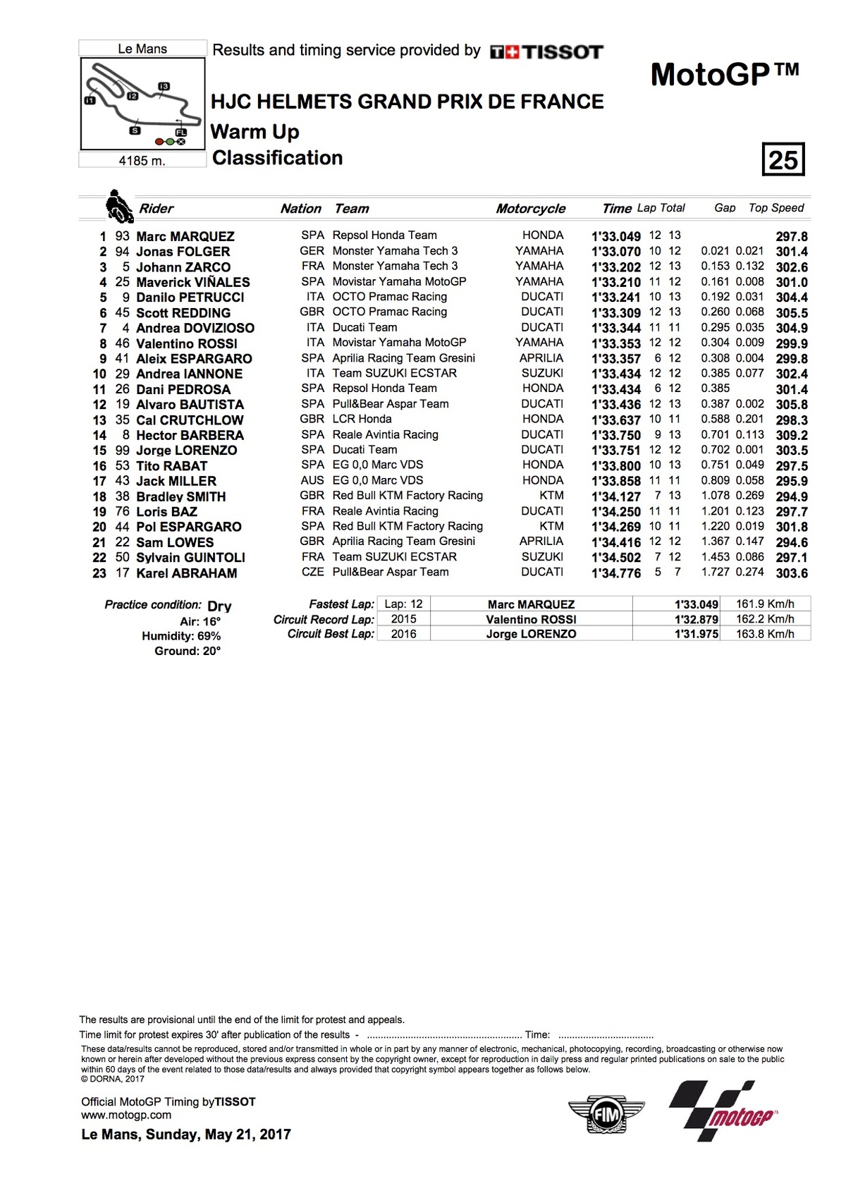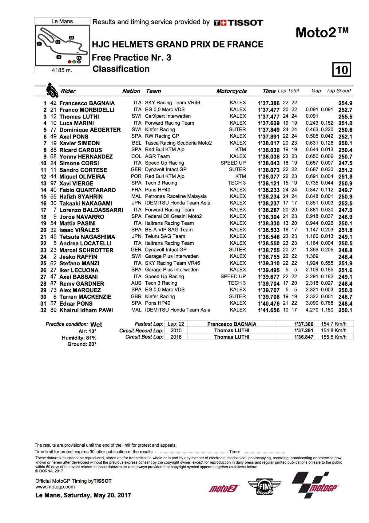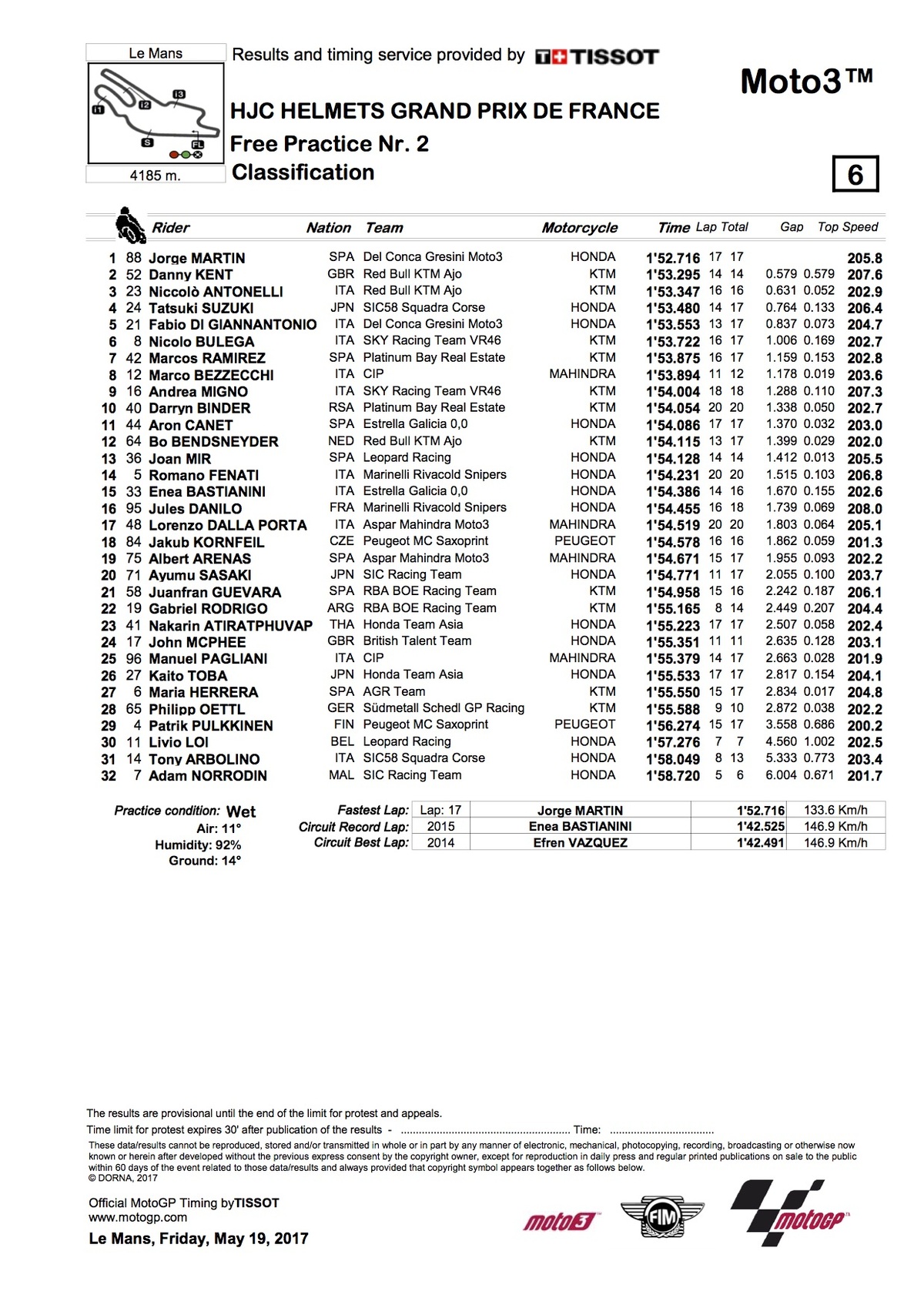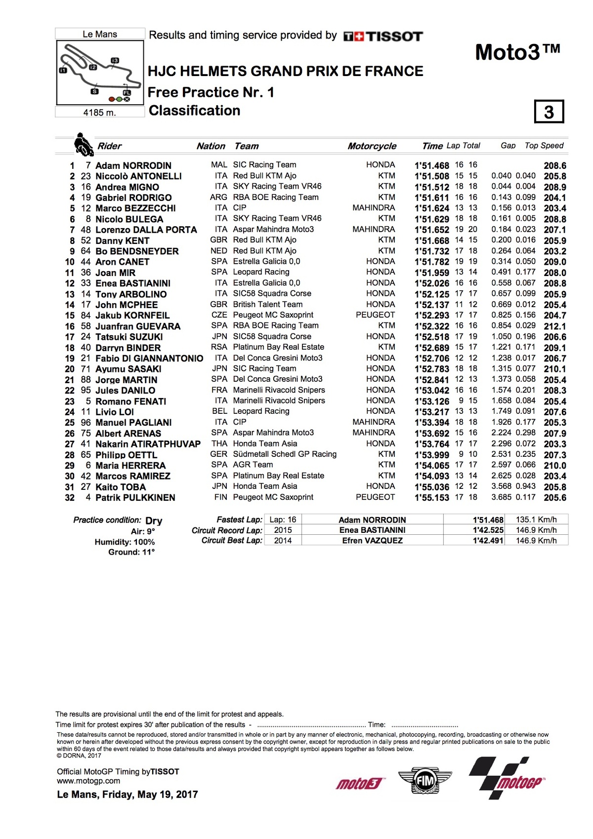 Buon giorno da Le Mans. Entra in pista la Moto3 per la FP3. Fa ancora freddo, ma c’è la speranza che le condizioni migliorino.