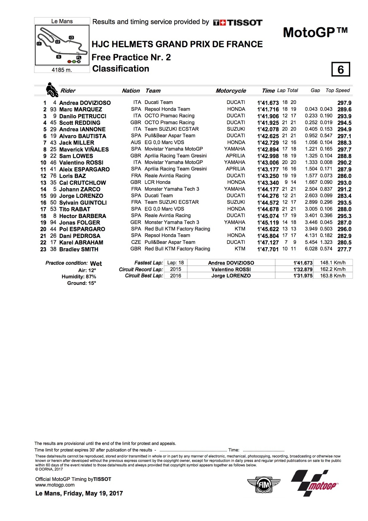 La pista è ancora umida, in alcuni tratti proprio bagnata. Ma sta uscendo il sole, per la fine della MotoGP potrebbe anche essere asciutta per azzardare le click. Ricordo che, tra gli altri, al momento sono fuori dai 10 Iannone, Pedrosa, Dovizioso, Petrucci, Lorenzo…