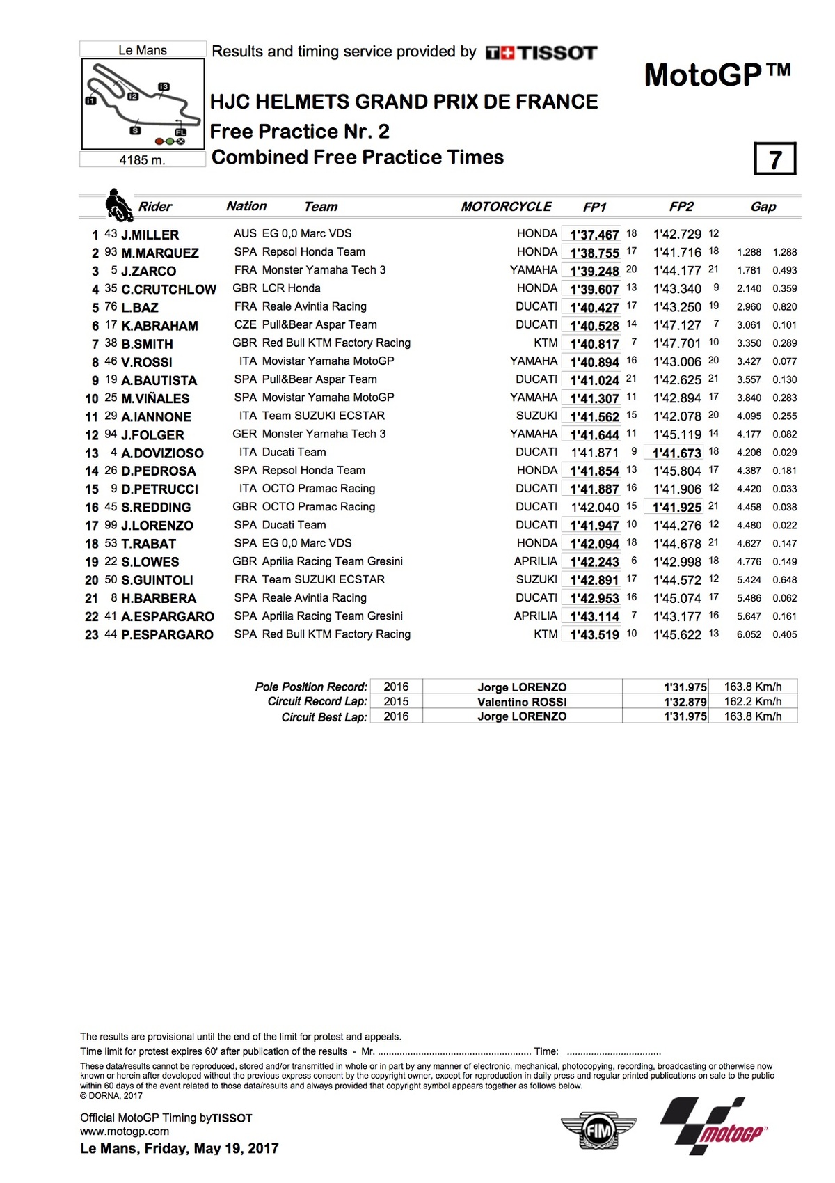 Tempi altissimi per il momento per la Moto3: McPhee è primo in 1’52”681 (il giro più veloce di Le Mans è 1’42”491 del 2014)