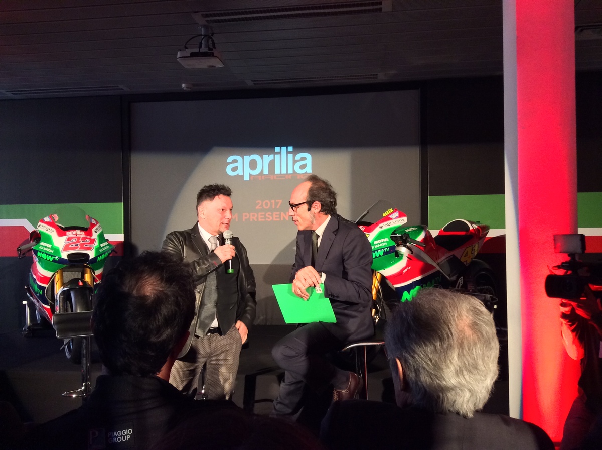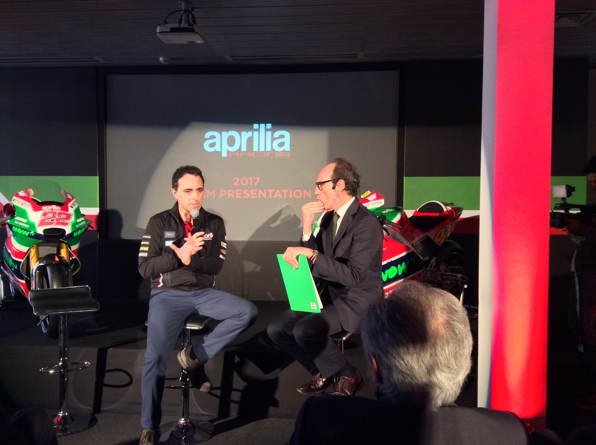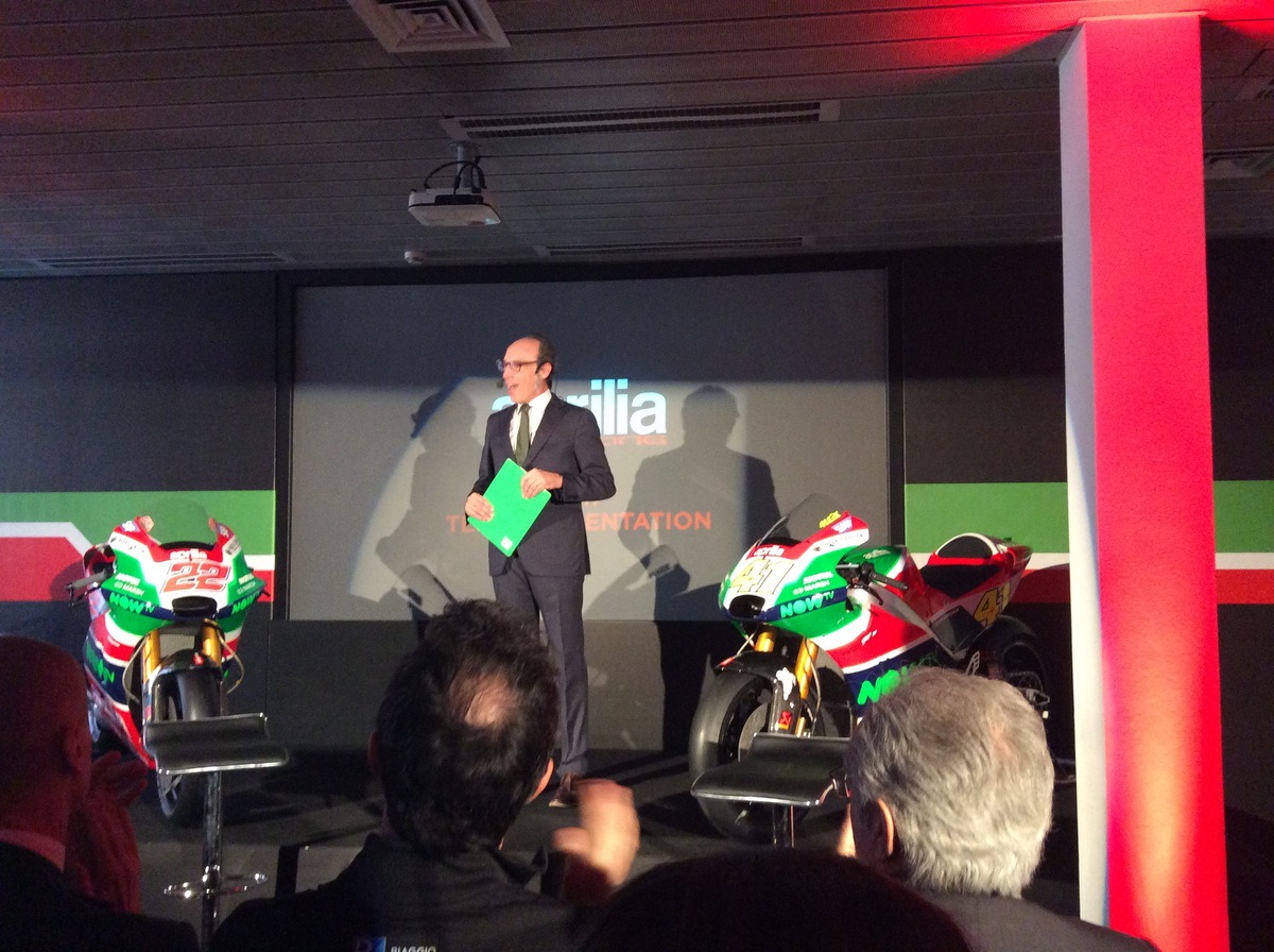 «Ho dato come obbiettivo quello di arrivare primi! Noi abbiamo scelto i colori della nostra bandiera perché rappresenta tutti noi e questa moto nasce completamente in Italia, fino all'ultima vite. Aprilia Racing rappresenta una delle punte di eccellenza tecnologica del Gruppo Piaggio. Le competizioni sono infatti il punto più alto della sperimentazione e dello sviluppo di soluzioni tecnologiche delle quali beneficiano tutti prodotti e tutti i brand del Gruppo. Lo scorso anno abbiamo fatto esordire la nostra RS-GP, la prima MotoGP progettata e costruita interamente qui a Noale, nella seconda metà della scorsa stagione la nuova moto ha messo in mostra progressi netti, entrando con regolarità nella top-ten. Quest’anno vogliamo proseguire nel nostro percorso di crescita, insidiare costruttori che sono in questa categoria da decenni e abbiamo tutto per poter centrare questo obiettivo: uomini, tecnologia, esperienza e tanta passione. La storia sportiva di Aprilia racconta di 54 Titoli Mondiali, la maggior parte, ben 28, conquistati da quando Aprilia è parte del Gruppo Piaggio. Una storia di così grandi successi ci impone di lavorare per essere sempre protagonisti con l’obiettivo di continuare ad affascinare e divertire i giovani che da sempre sono il grande patrimonio di Aprilia».
