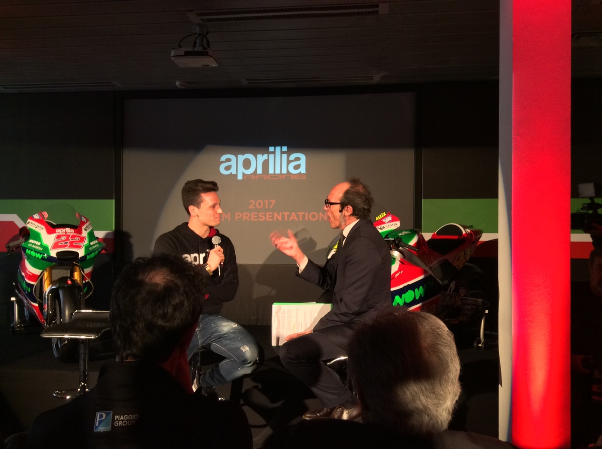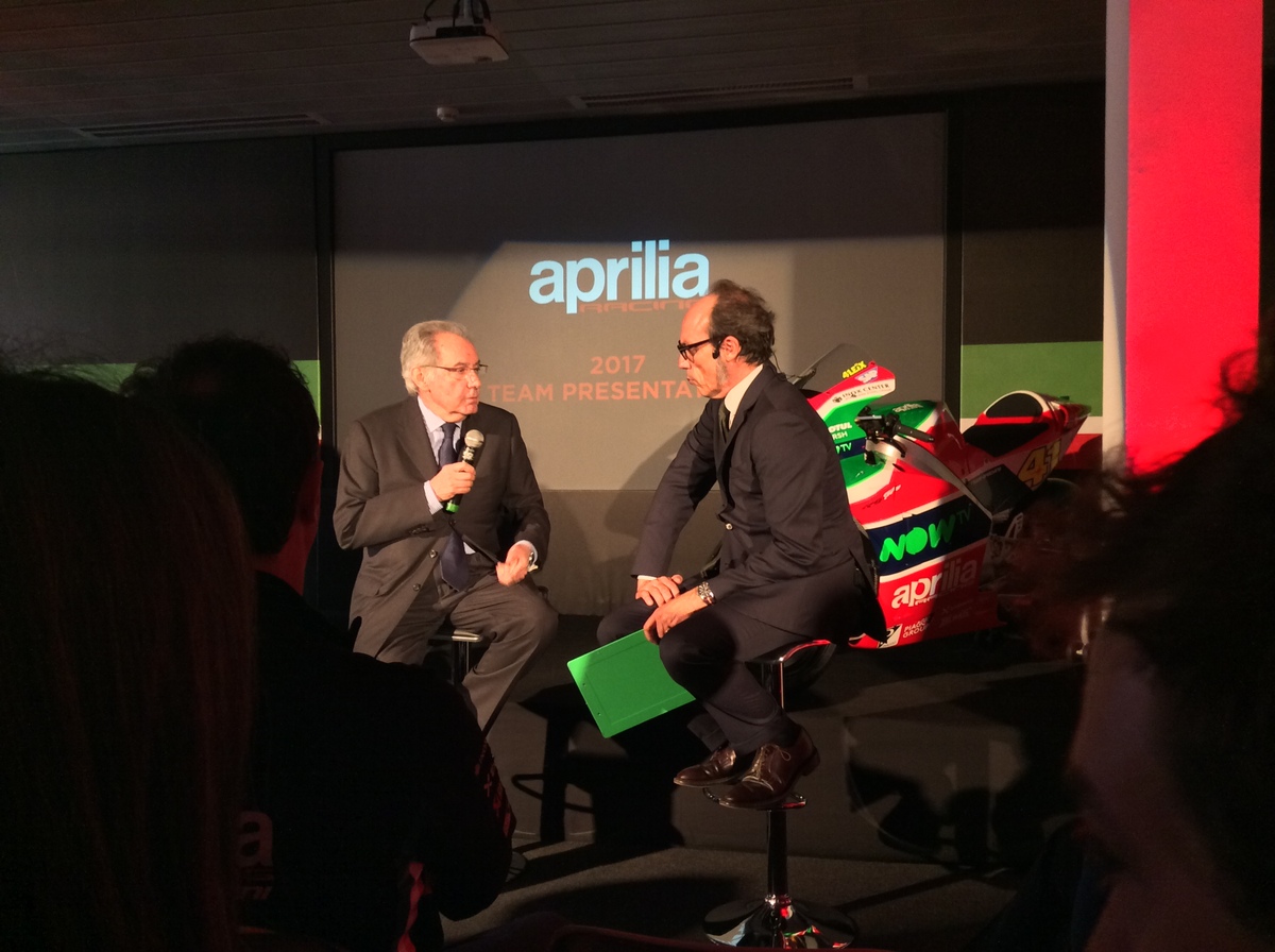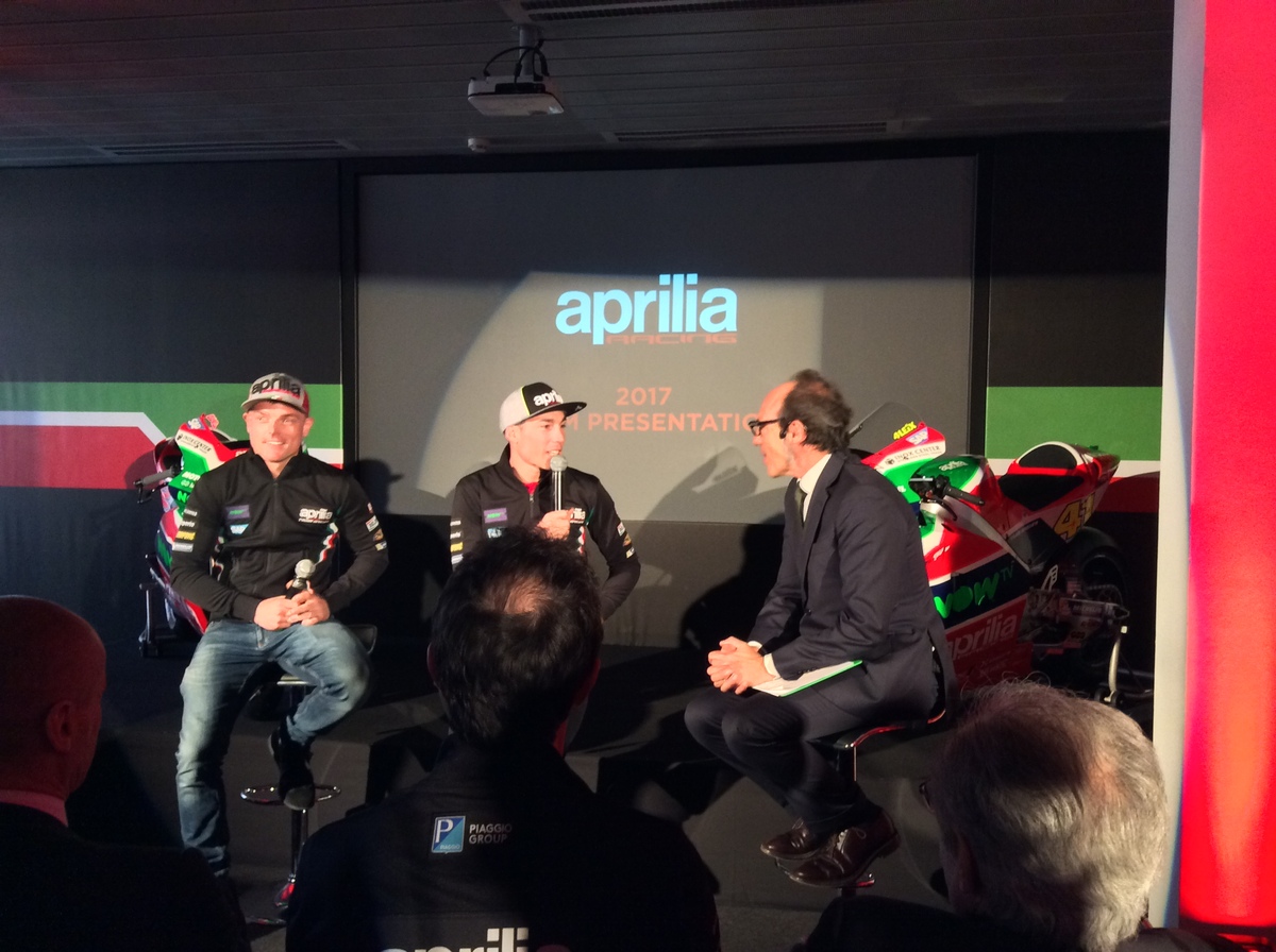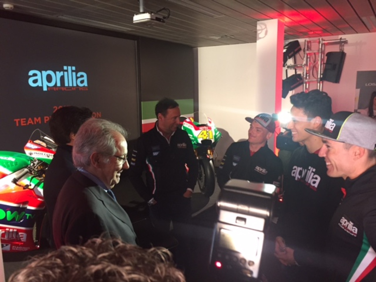 «Ho dato come obbiettivo quello di arrivare primi! Noi abbiamo scelto i colori della nostra bandiera perché rappresenta tutti noi e questa moto nasce completamente in Italia, fino all'ultima vite. Aprilia Racing rappresenta una delle punte di eccellenza tecnologica del Gruppo Piaggio. Le competizioni sono infatti il punto più alto della sperimentazione e dello sviluppo di soluzioni tecnologiche delle quali beneficiano tutti prodotti e tutti i brand del Gruppo. Lo scorso anno abbiamo fatto esordire la nostra RS-GP, la prima MotoGP progettata e costruita interamente qui a Noale, nella seconda metà della scorsa stagione la nuova moto ha messo in mostra progressi netti, entrando con regolarità nella top-ten. Quest’anno vogliamo proseguire nel nostro percorso di crescita, insidiare costruttori che sono in questa categoria da decenni e abbiamo tutto per poter centrare questo obiettivo: uomini, tecnologia, esperienza e tanta passione. La storia sportiva di Aprilia racconta di 54 Titoli Mondiali, la maggior parte, ben 28, conquistati da quando Aprilia è parte del Gruppo Piaggio. Una storia di così grandi successi ci impone di lavorare per essere sempre protagonisti con l’obiettivo di continuare ad affascinare e divertire i giovani che da sempre sono il grande patrimonio di Aprilia».