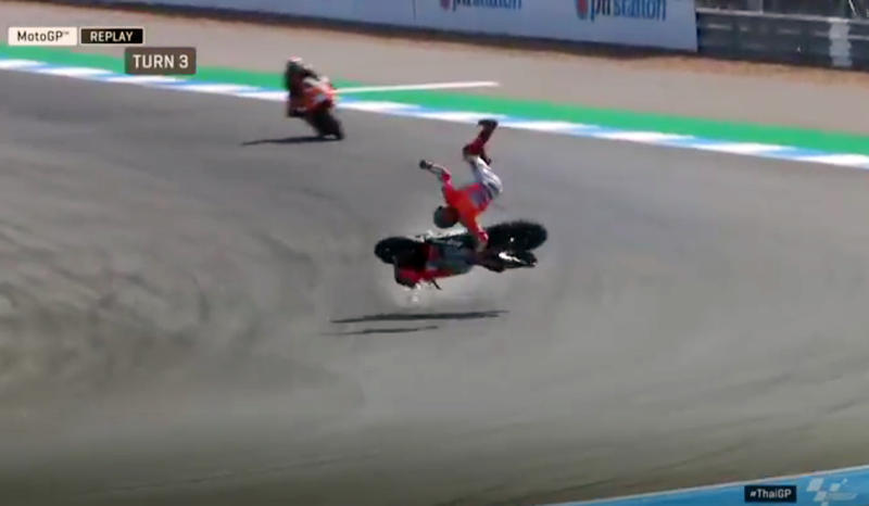 Fa un gran caldo a Buriram, la temperatura sull’asfalto è superiore ai 50 °C (53 °C): siamo al limite della sopportazione fisica e tecnica. Ed è forse un problema tecnico che ha causato la terribile caduta di Jorge Lorenzo alla curva 3, a circa 14 minuti dal termine delle FP2, poi fermate a -12’20 con la bandiera rossa, per pulire l’asfalto dai detriti della Ducati distrutta dall’impatto. Nonostante il terribile “high-side”, Lorenzo non ha mai perso conoscenza, ma ha subito colpi fortissimi, purtroppo anche al piede destro, lo stesso infortunato ad Aragon.