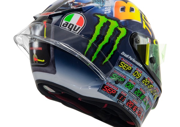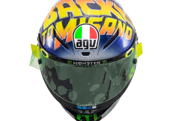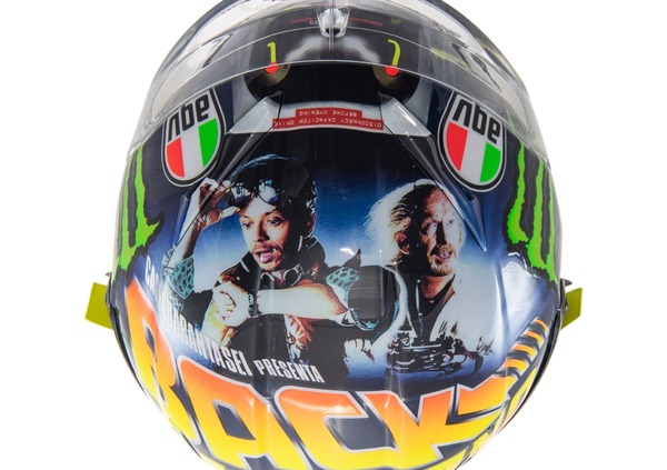 Palese la citazione da Ritorno al Futuro, con le date programmate sul lato destro del casco e la DeLorean del film sull'altro lato. La scritta "Back to Misano", negli stessi caratteri della locandina originale del film di Zemeckis (che lanciò qui in Italia Michael J. Fox e le sue Nike) e, sul retro del casco, Valentino stesso nel ruolo di Marty McFly e Silvano Galbusera nei panni di "Doc" Brown.