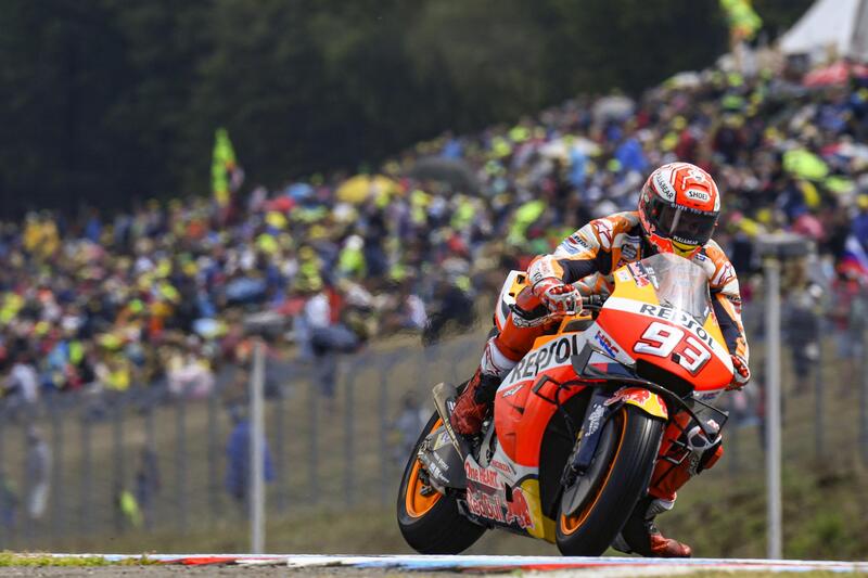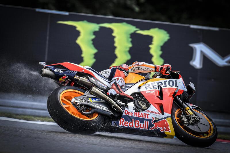 BRNO - L’immagine della giornata, è quella di Marc Marquez che transita all’ultima curva con le slick, piegato come se fosse asciutto, mentre piove a dirotto. “Nello stesso punto, con le stesse gomme, Miller è caduto, lui è passato con il gomito a terra” dice quasi allibito Danilo Petrucci. “Lui vuole sempre dimostrare di essere il più forte: tanto di cappello”, aggiunge Andrea Dovizioso.
