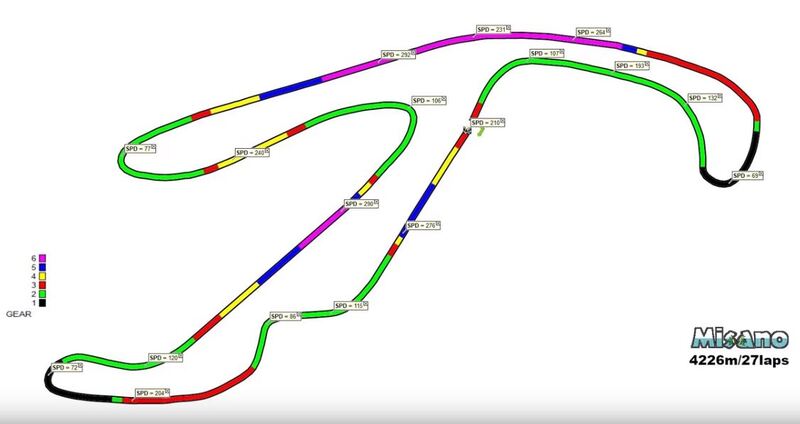 La sesta solo in due parti della pista. Prima della curva della Quercia e poi nel tratto del curvone, che è ancora più bello da quando lo si percorre al contrario rispetto al tracciato originario. Una pista lenta per la MotoGP, con rapporta tura del cambio simile al Saschsenring, dove interviene molto di frequente l'elettronica per il controllo della potenza al fine di scaricare la motricità e preservare la gomma posteriore. Serve una moto stabile in staccata e capacità da parte del pilota nell'affrontare il curvone del quale la linea unica va fatta "a memoria".