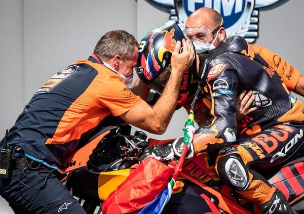 ’immagine che scegliamo, però, ha per protagonista suo fratello Marc, che ha seguito la gara da casa e che ha postato un video su Instagram in cui documenta la sua esultanza. Gli occhi di tutti vanno sul braccio destro dell’otto volte campione del mondo, tenuto praticamente fermo. In tutti si insinua il sospetto che nel recupero di Marc Marquez le cose stiano andando tutt’altro che bene e la stampa spagnola ipotizza la possibilità di un terzo intervento chirurgico. Il GP è segnato anche dall’assenza di Valentino Rossi, rimasto a casa dopo aver contratto il Covid-19.