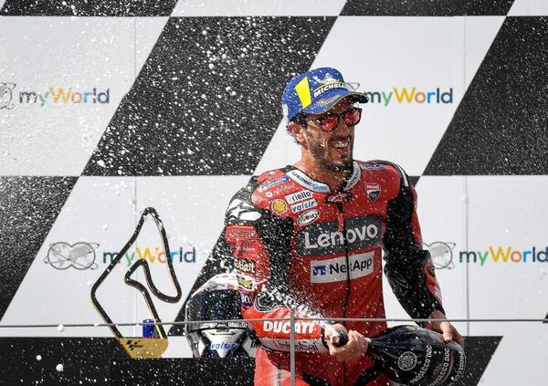 Danilo Petrucci che sotto la pioggia taglia per primo il traguardo in sella alla sua Desmosedici e si porta il dito al naso in segno di silenzio è l’immagine che abbiamo scelto. L’abbiamo scelta perché per Petrucci sarà l’ultima vittoria in sella ad una Rossa dopo una carriera targata Borgo Panigale, prima del passaggio a KTM.