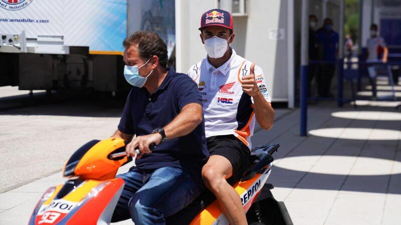 Marquez entra al box apparentemente tranquillo: il braccio destro è visibilmente più gonfio - è stata fatta una protezione per evitare che la tuta pesi troppo sull’arto operato solo martedì -, ma al box Marc si muove con relativa disinvoltura. Poi sale in sella, va subito veloce, ma si vede che fatica alla frenata della curva 6, quella più violenta, perché segue il rettilineo più lungo e bisogna rallentare un bel po’ la moto. Marc scende fino a 1’37”882 a 1”298 dal miglior tempo, mette insieme 18 giri, forse anche con il pieno di benzina, nel finale fa la prova di partenza, ma quando torna al box è ovviamente sofferente. Scende dalla moto e va nel motorhome seguito dal suo tecnico Santi Hernandez, dal manager Emilio Alzamora e dal Dottor Angel Charte: probabile che si debba decidere se continuare ed, eventualmente, se c’è da fare qualche aggiustamento alla medicazione.