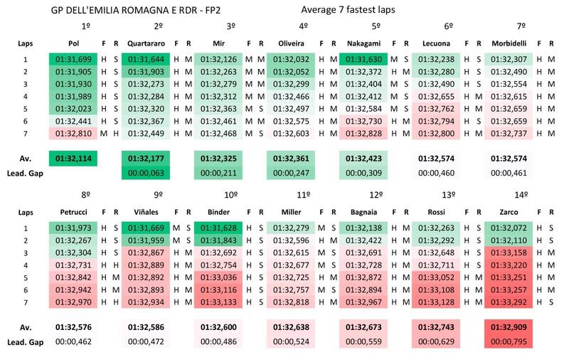 Ecco il passo gara delle FP2, con anche le gomme utilizzate. L’analisi conferma che Pol Espargaro, Fabio Quartararo e Alex Rins sono quelli più costanti ed efficace, ma alcuni piloti, come per esempio Morbidelli e Dovizioso, hanno girato con medie usate delle FP1