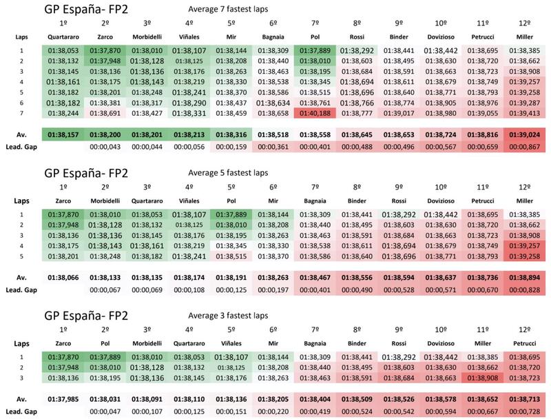 In collaborazione con Antonio Lopez, ecco l’analisi della giornata di libere, attraverso i tempi delle FP2. Antonio prende in considerazione la media dei 7, 5 e 3 migliori giri realizzati da ciascun pilota.