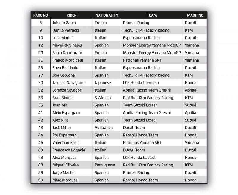 In MotoGP saranno tre gli esordienti: Enea Bastianini, fresco campione del mondo Moto2, Luca Marini, secondo in campionato, e Jorge Martin. Enea e Luca saranno insieme nell’Esponsorama Racing team, mentre Jorge Martin vestirà i colori del Pramac Racing. Tanti cambiamenti all'interno dei box. Nel team ufficiale Ducati vedremo Bagnaia e Miller. In quello Yamaha accanto a Viñales ci sarà Quartararò al posto di Rossi, che passa al team satellite insieme a Morbidelli. Pol Espargaró entrerà nel Repsol Honda Team, e nel box KTM Oliveira e Binder, mentre Petrucci e Lecuona militeranno nel team Tech3. In Aprilia, al fianco di Aleix Espargaró, troveremo, provvisoriamente, Lorenzo Savadori.