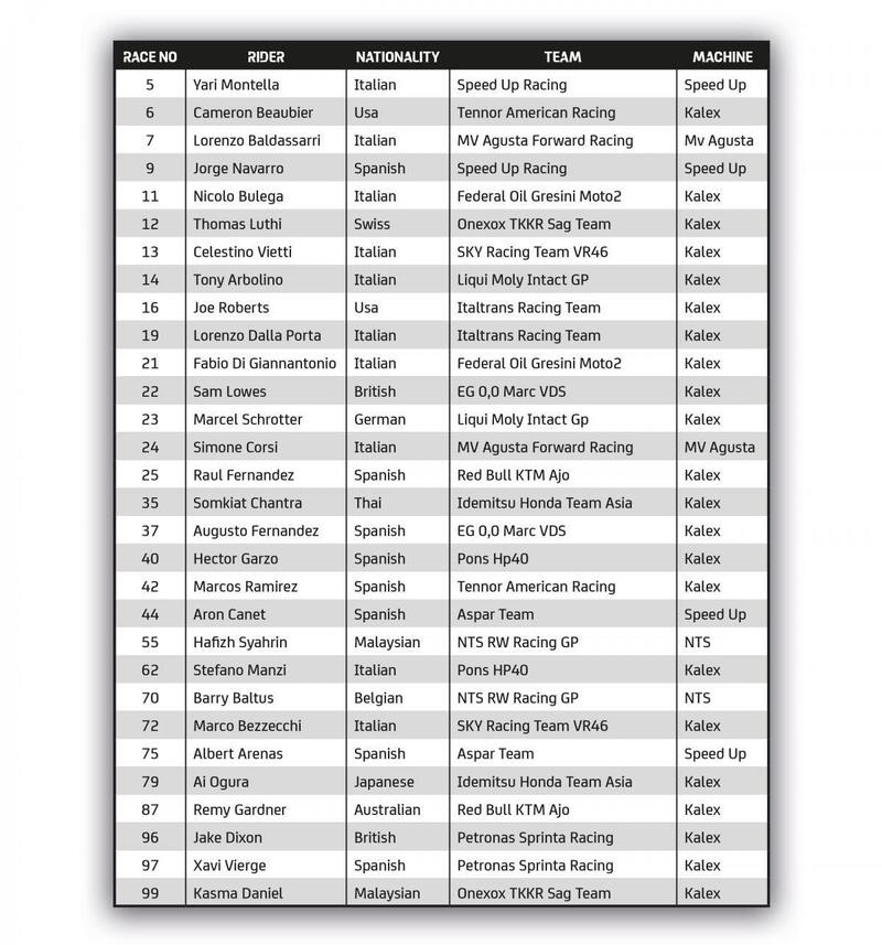 La Moto2 accoglierà otto debuttanti nel 2021: l’americano Cameron Beaubier; il Campione Europeo FIM CEV Repsol Moto2, Yari Montella, che sarà il compagno di squadra di Jorge Navarro, mentre il Campione del Mondo Moto3, Albert Arenas, resterà col Team Aspar ma passando alla classe intermedia. Celestino Vietti, Tony Arbolino, Raúl Fernández e Ai Ogura sono altri debuttanti. Joe Roberts passa nella squadra Italtrans Racing, mentre Fabio Di Giannantonio torna nelle file del Gresini Racing.