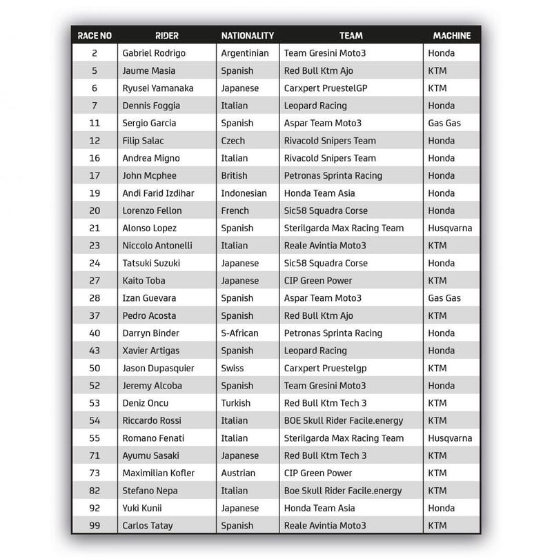In Moto3 ci saranno cinque esordienti, tra i quali il vincitore della Red Bull MotoGP Rookies Cup 2020, Pedro Acosta, che condividerà il box con Jaume Masia nel Red Bull KTM Ajo. Il Campione del Mondo Junior FIM CEV Repsol Moto3, Izan Guevara, si unisce alla scuderia del campione in carica Aspar; Lorenzo Fellon sostituisce Niccolò Antonelli nella SIC58 Squadra Corse. Xavier Artigas ottiene la sua prima opportunità a tempo pieno col Leopard Racing, e Andi Izdihar fa uno scambio di sella e di categoria con Ogura.