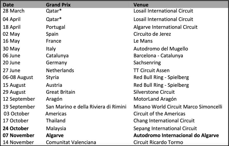 Di conseguenza, il GP della Malesia è stato anticipato, e si correrà una settimana prima di quanto precedentemente fissato - dal 22 al 24 di ottobre - nel weekend antecedente il GP della Thailandia. Inoltre, in sostituzione della prova australiana, il calendario della MotoGP 2021 inserisce il Gran Premio dell'Algarve, dal 5 al 7 novembre, sul circuito di Portimao in cui il Motomondiale farà quindi una seconda tappa nella settimana precedente il canonico gran finale al Gran Premio della Comunitat Valenciana sul Ricardo Tormo di Valencia.