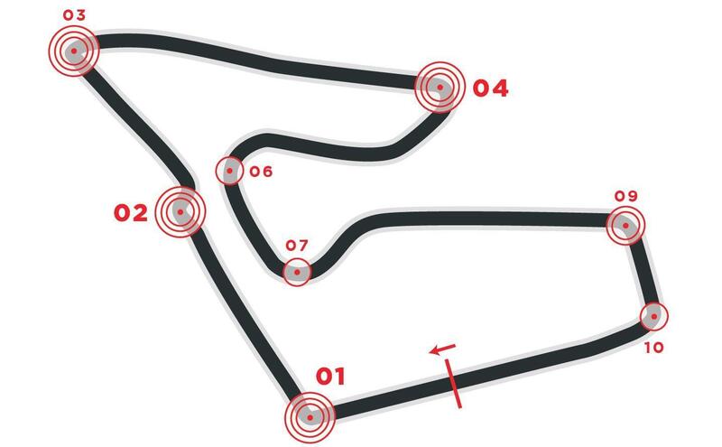 La nuova variante, curva 2, si affronta a 260 orari: è diventata la terza staccata più impegnativa del circuito. Lo spazio di frenata è di 200 metri, si percorre in 4,5” e la velocità scende a 100 km/h. In questo caso la decelerazione massima è di 1,5 g.