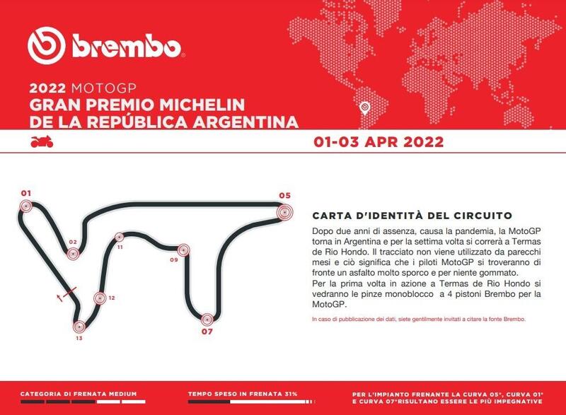 In 8 delle 14 curve di Termas de Rio Hondo i piloti della MotoGP utilizzano i freni per un totale di 30 secondi al giro, lo stesso valore del Mugello, che però risulta più lungo di quasi mezzo chilometro. Dalla partenza alla bandiera a scacchi ciascun pilota si servirà dei freni per 12 minuti e mezzo, pari al 31% della gara.