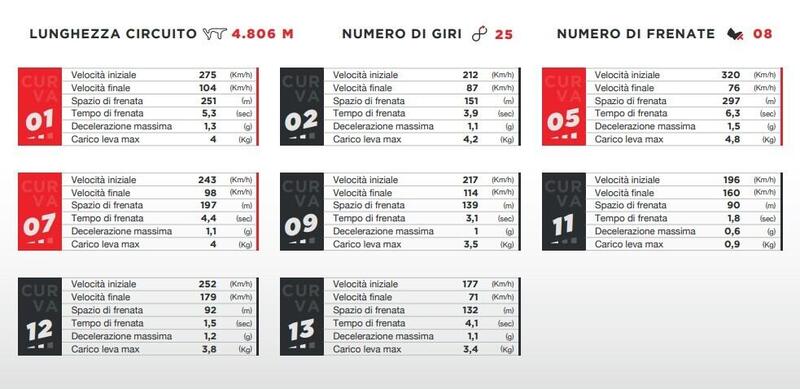 Tutte le decelerazioni più dure sono racchiuse nelle prime 5 curve della pista argentina. Nelle restanti la riduzione di velocità non raggiunge nemmeno i 110 km/h e gli spazi di frenata sono inferiori a 140 metri. Sommando tutte le forze esercitate dal via fino all’arrivo sulla leva del freno Brembo da ciascun pilota si superano di poco i 7 quintali, il secondo valore più basso della stagione dopo il GP Australia.