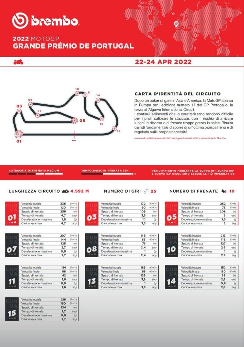 In 10 delle 15 curve del tracciato lusitano i piloti della MotoGP utilizzano i freni sul giro per 32 secondi, pari al 33 per cento della durata della gara. Per la Superbike le staccate sono le medesime ma la durata differente: meno di 31 secondi al giro, equivalenti al 31 per cento del tempo totale della manche.