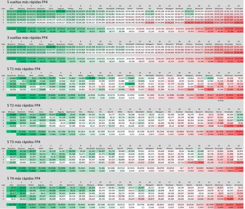 Analizzando i tempi, si può vedere che Quartararo affonda nel T3, che corrisponde al lungo rettilineo del COTA, dove non finisce più in alto del decimo posto. La mancanza di potenza della Yamaha è un grosso problema per il pilota francese. I fogli dei tempi mostrano anche che il T1 è il tallone d'Achille di Bastianini, così come il T4 per Marquez.