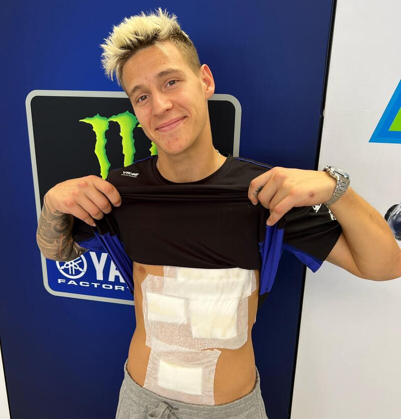 Quartararo nell'incidente (piuttosto drammatico a vedersi: qui la spiegazione che ne ha dato Marc Marquez e il VIDEO), si è procurato delle bruciature sul petto.