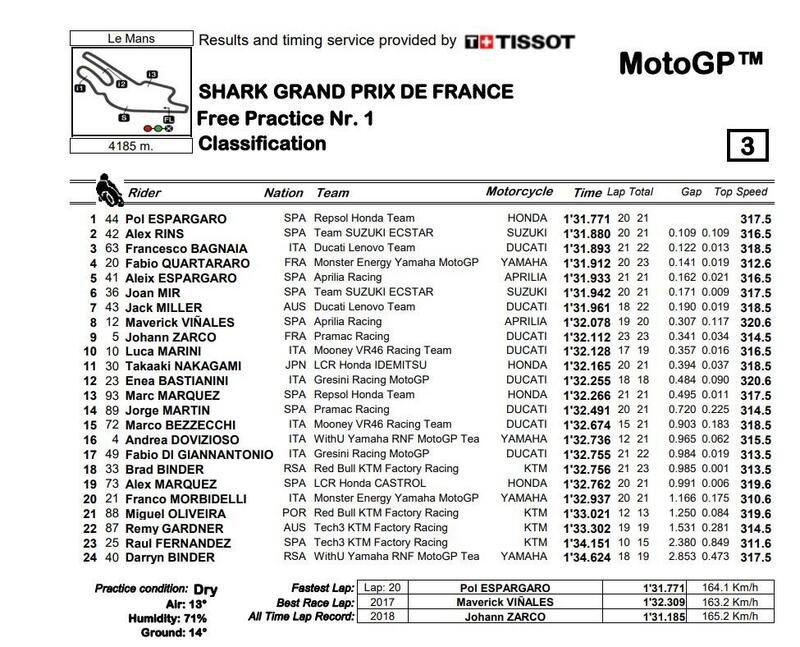 Quasi tutti i piloti hanno girato con la soffice all’anteriore e la media al posteriore, con Fabio Quartararo, quarto, che ha impressionato sul passo: in questo turno è stato lui il più regolare.