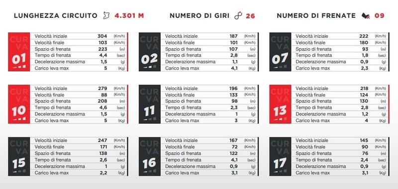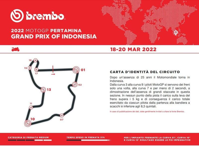 Secondo i tecnici Brembo che lavorano con i 24 i piloti della classe regina, quello indonesiano rientra fra i circuiti mediamente impegnativi per i freni. In una scala da 1 a 5 si è meritato un indice di difficoltà di 3.