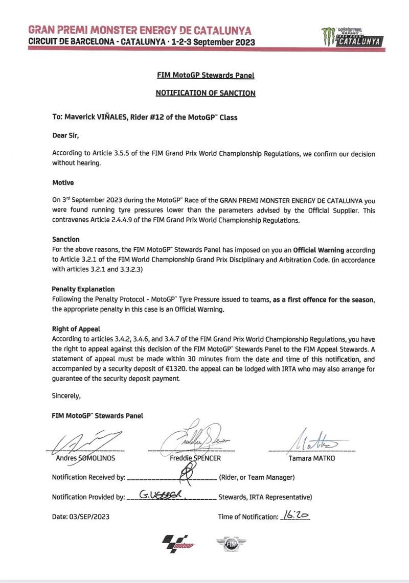 Il primo pilota trovato con pressione delle gomme irregolare a fine gara è Maverick Vinales. Per il pilota Aprilia i commissari sportivi della MotoGP hanno emesso un richiamo ufficiale.