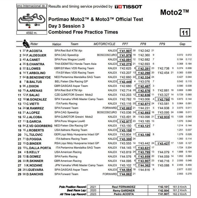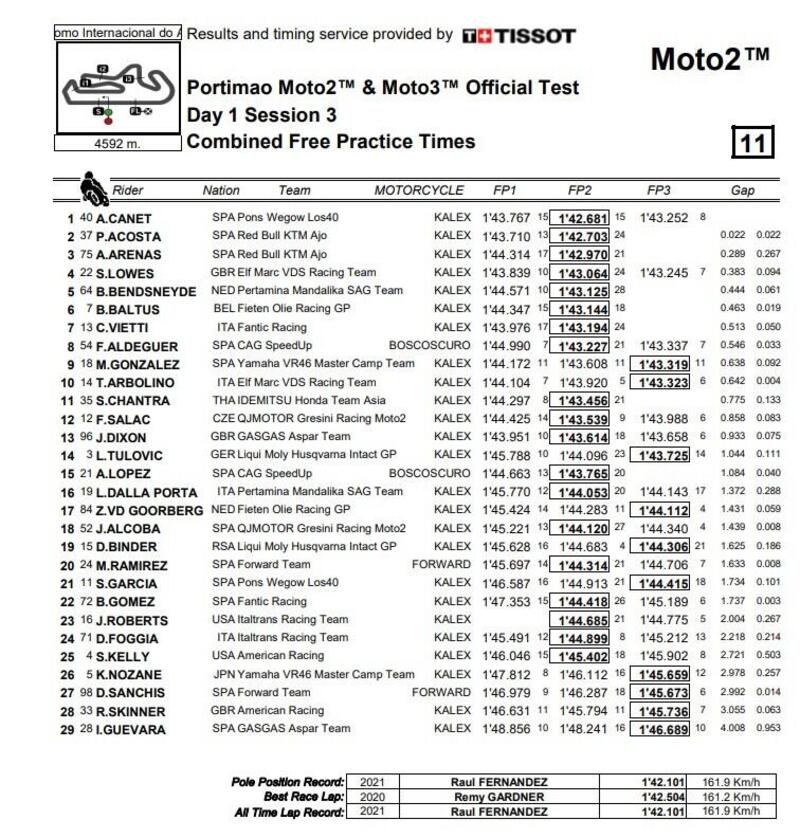 Giorno 3. Ancora Acosta a dominare la scena con 1’41.907, seguito da Aldeguer in crescita e Canet. Quarto Chantra, quinto Lowes e sesto Arbolino. Il compagno di Acosta ha finito decimo. Vietti 13esimo, Lopez 15, Garcia 17, Foggia 21, ancora in difficoltà Guevara, penultimo.