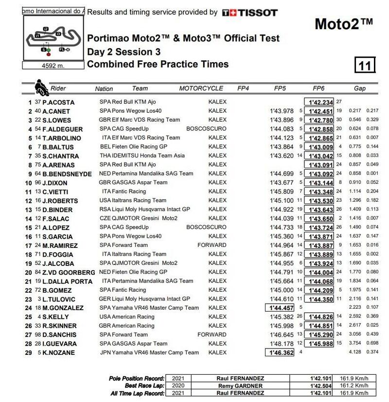 Giorno 2. Acosta ancora davanti a tutti con 1’42.234, seguito ancora da Canet e Lowes, Quarto Aldeguer, quinto Arbolino. 11esimo Vietti, 12esimo Roberts, 15esimo Lopez, 16esimo Garcia, 18esimo Foggia, 28esimo e penultimo Guevara.