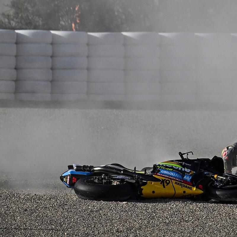 Cade, ma vuole finire a tutti i costi il suo ultimo GP da pilota. Bello per lo sport.
