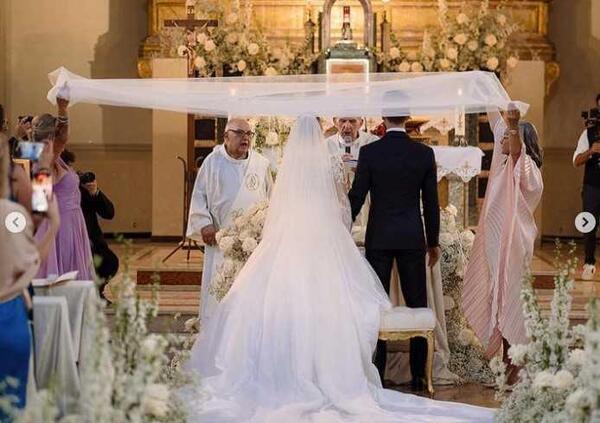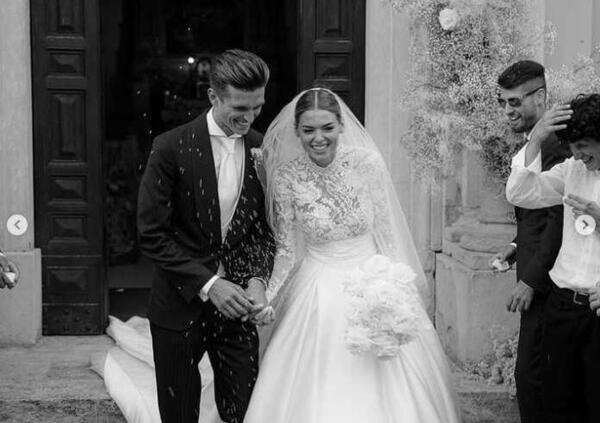 Luca aveva invece un abito scuro con camicia e cravatta bianche. La bellissima moglie, Marta Vincenzi, un classico abito bianco con strascico lunghissimo e mazzo di fiori bianchi in mano.