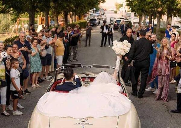 Il matrimonio di Marini e Vincenzi è stato celebrato a Tavullia. Il fratelli Valentino è arrivato con la figlia Giulietta in braccio, con la compagna Francesca Sofia Novello vestita di rosa.