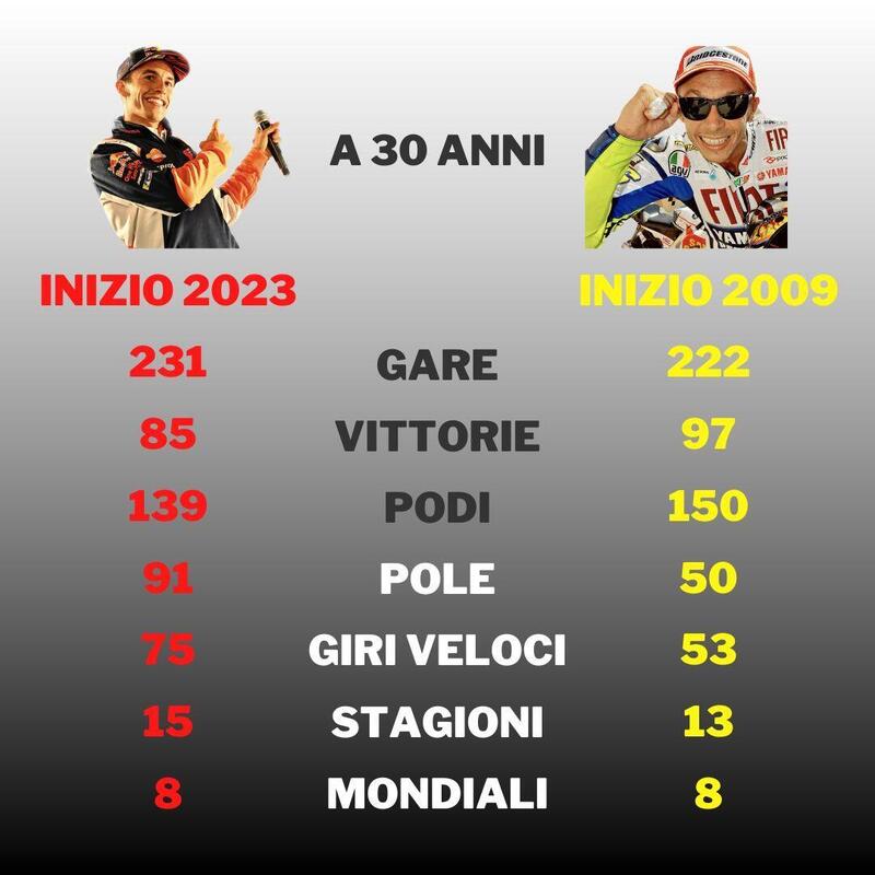 Il primo dato da segnalare è che, all'inizio della stagione in cui hanno 30 anni cioè la 2023 per Marquez e la 2009 per Rossi entrambi hanno vinto otto mondiali.