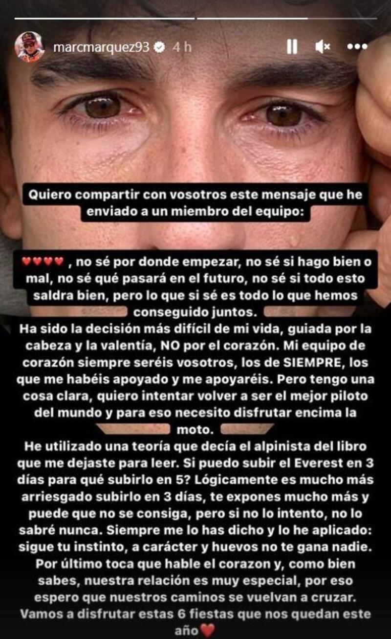 Più toccanti le parole nella storia di IG, corredate da una foto del volto del pilota, in lacrime. Si tratta di un messaggio che Marquez ha scritto a un amico-membro della sua squadra. Con tutta probabilità si tratta di Santi Hernandez.