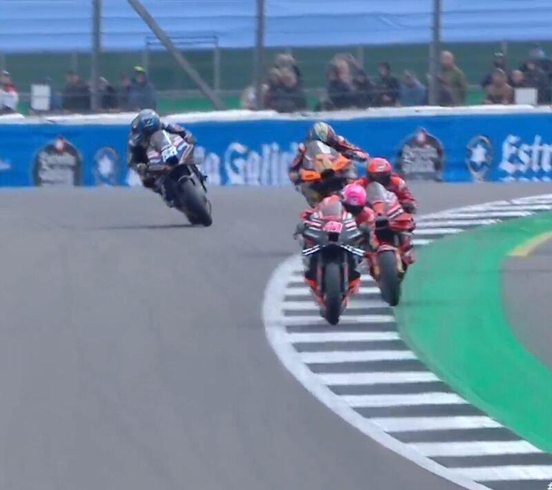 Il contatto c’è stato sicuramente, ma le immagini mostrate - la camera montata sulla moto di Marquez, ma rivolta verso il pilota e non verso la pista - non chiariscono perfettamente la dinamica. Marquez ha dichiarato di aver toccato con la leva, la gomma di Bastianini, ma, per quello che si vede, sembrerebbe che lo abbia centrato con la parte anteriore della carenatura, tanto che sullo pneumatico di Enea c’era un bel taglio centrale. Ma non si può dire niente di più.