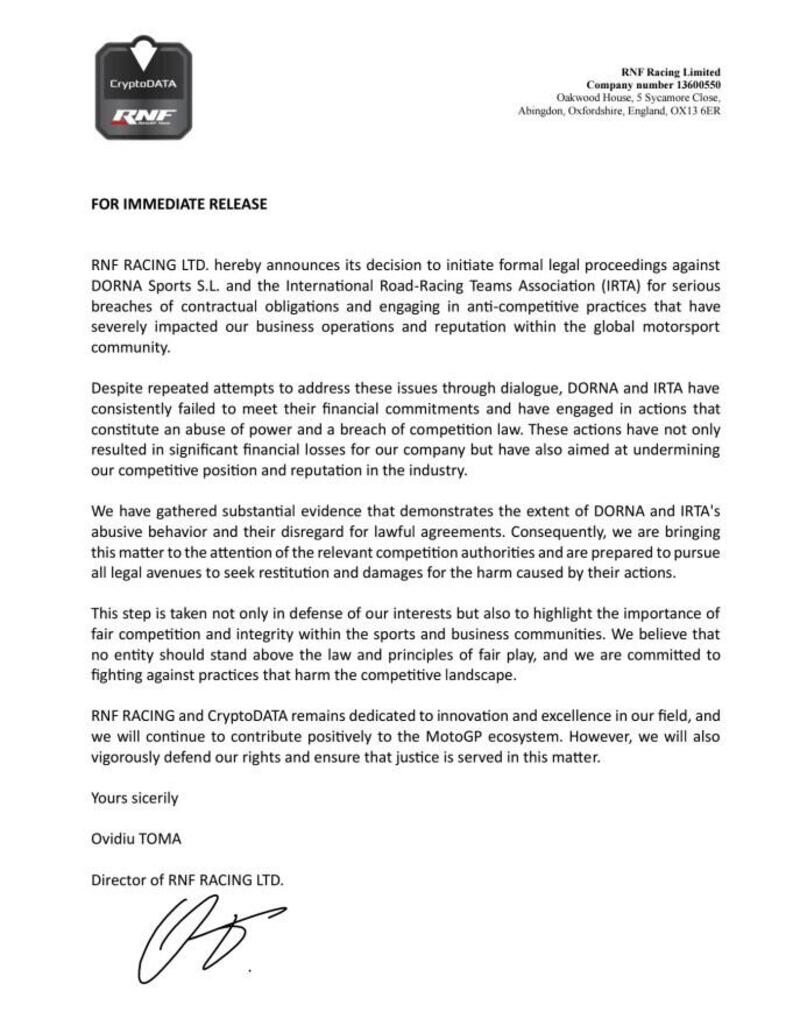 “La RNF Racing Ltd annuncia la sua decisione di avviare un procedimento legale formale contro Dorna Sports SL e l'International Road-Racing Teams Association (IRTA) per gravi violazioni degli obblighi contrattuali e per la partecipazione a pratiche azioni anticoncorrenziali che hanno seriamente compromesso le nostre operazioni commerciali e la nostra reputazione all’interno della comunità globale degli sport motoristici”.